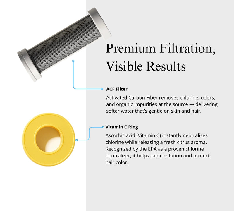 ACF filtration removes harsh chlorine before it strips your skin barrier. The result? No more post-shower tightness — just calm, smooth, hydrated skin.